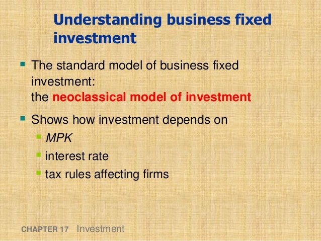 Determinants of business fixed investment in macroeconomics. Business fixed investment private capital spending excluding outlays on dwellings has been weak in many of the worlds industrialised economies during 2001 and 2002. Meade put it a greater amount of fixed capital should be invested so long as the annual interest on. Net investment deducts depreciation from gross investment.